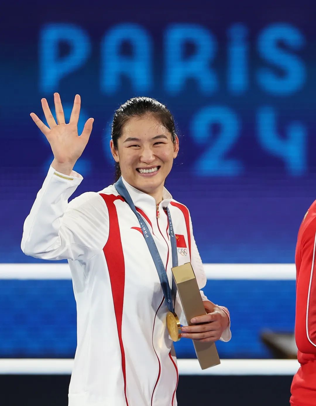 全红婵一身红色运动服,她一出现,就以其标志性的笑容和亲和力瞬间吸引了所有人的目光。