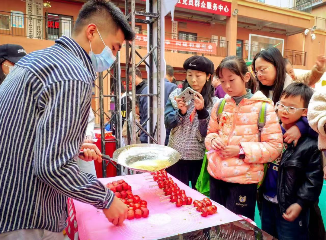 美食品尝区作为此次活动的亮点区域之一,桂花米酒汤圆、咸味小吃、糖葫芦、糖画等美食琳琅满目,香气四溢。孩子们兴奋地围绕着糖画和糖葫芦的摊位,看着师傅们巧手翻飞,将一滴滴糖液或是化作栩栩如生的图案,或是串起红艳艳的山楂果。而在一旁的铁锅里,汤圆翻腾,热气腾腾,许多居民早已迫不及待地在旁边等候,只为品尝这一口冬日里的甜蜜与温暖。