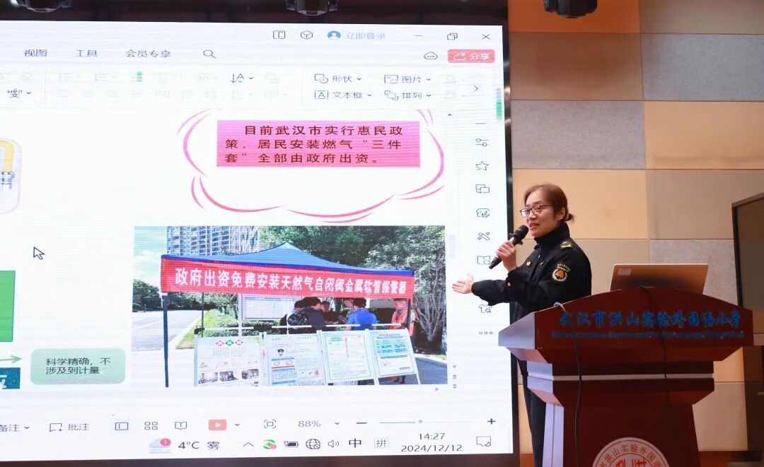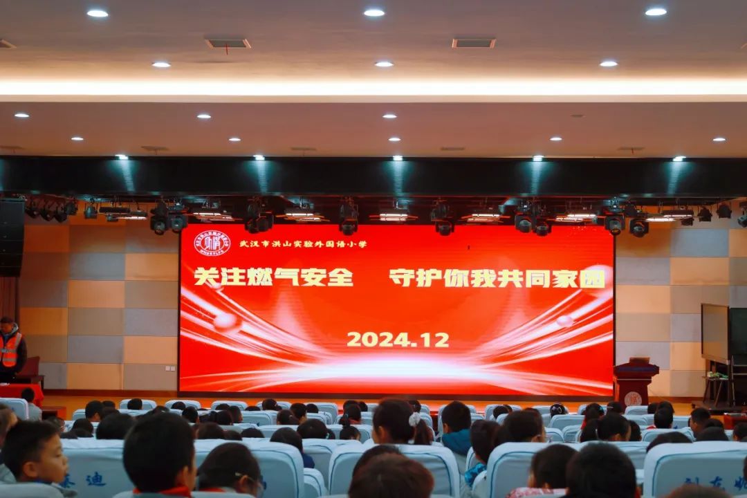 12月12日下午,洪山区城市管理执法局联合卓刀泉街道、武汉市洪山实验外国语小学、武汉誉城千里建工有限公司举办了“关注燃气安全 守护你我共同家园”活动,两百余名小学生到场共同聆听了一节燃气安全知识课。