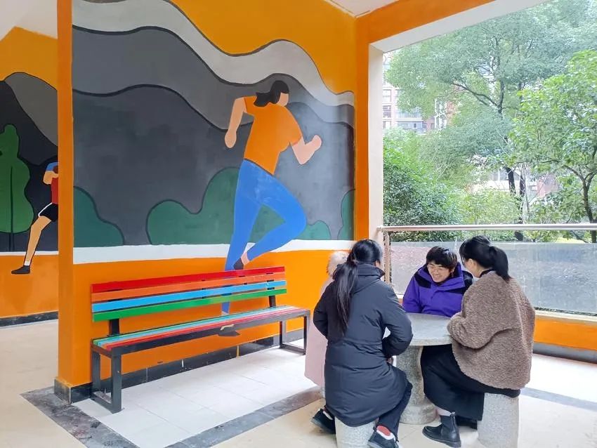 在阵地改造过程中,社区联接武汉民政职业学院艺术设计学院团委“艺心绘梦”志愿服务团队,为架空层进行墙面彩绘,合作打造既美观又实用的公共活动场所。
