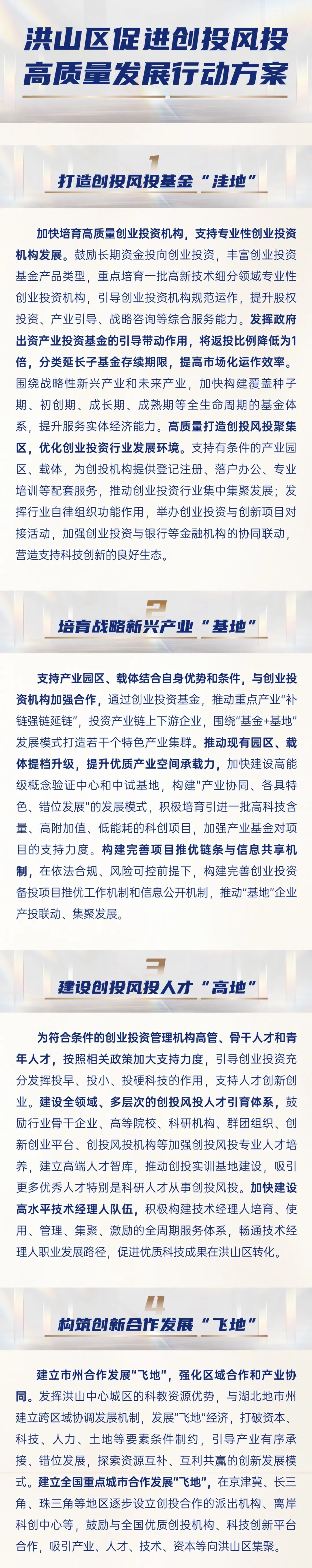 《行动方案》详细规划了洪山区未来三年在创投风投领域的发展蓝图,首次明确了“十大行动”。方案指出,力争用三年左右时间,汇集形成千亿级产业基金群、百亿级投早投小天使基金群;集聚创投风投机构和创投基金超过300家,吸引、培育1000名创投风投行业人才;建成不少于5万平方米的创投集聚基地;高水平建设武汉环大学创新经济带,高质量打造若干个特色产业集群。