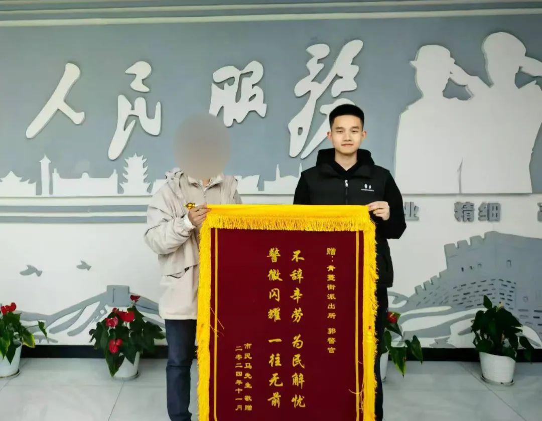 “卡里其实也没剩几个钱,我就是抱着试试看的心态来的,没想到咱们民警这么尽职尽责。”12月20日傍晚6时,马先生走进了青菱街派出所,将一面印有“不辞辛劳为民解忧 警徽闪耀一往无前”的鲜红锦旗交到了青年民警郭子昂的手中。原来,这都得益于郭子昂帮马先生追回了那家关门理发店里的充值余款。