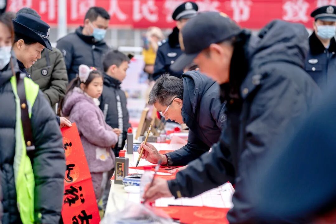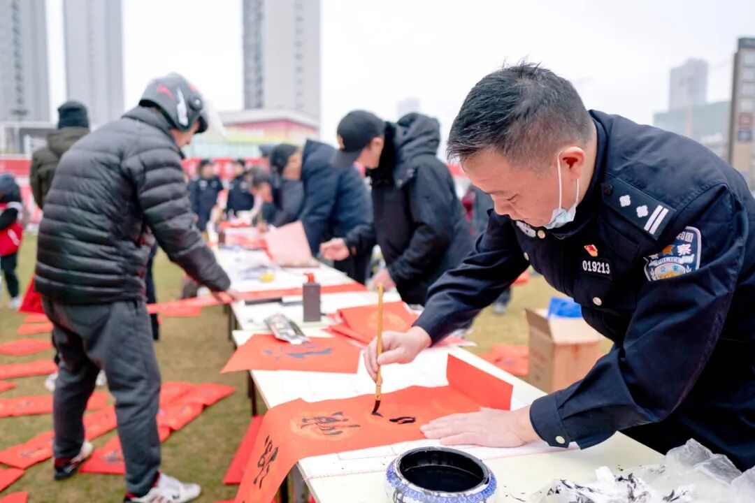 活动的一角,一排排红彤彤的春联纸整齐地悬挂在临时搭建的书法台前,5位来自社区书画社的书法高手与两名洪山警营书法爱好者们挥毫泼墨,笔走龙蛇,一幅幅寓意吉祥的春联瞬间跃然纸上。