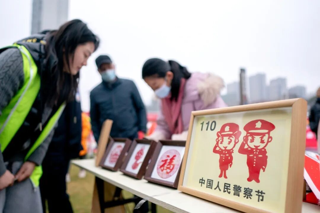 社区的剪纸艺术家李丹丹老师现场创作,她的巧手如同魔术师一般,红纸在她手中翻飞、折叠、剪裁,不一会儿,一幅幅精美的剪纸作品就呈现在了大家眼前。除了传统的“福”字剪纸,她还特别创作了一系列融入警察元素的剪纸作品,受到了在场群众的热烈欢迎。
