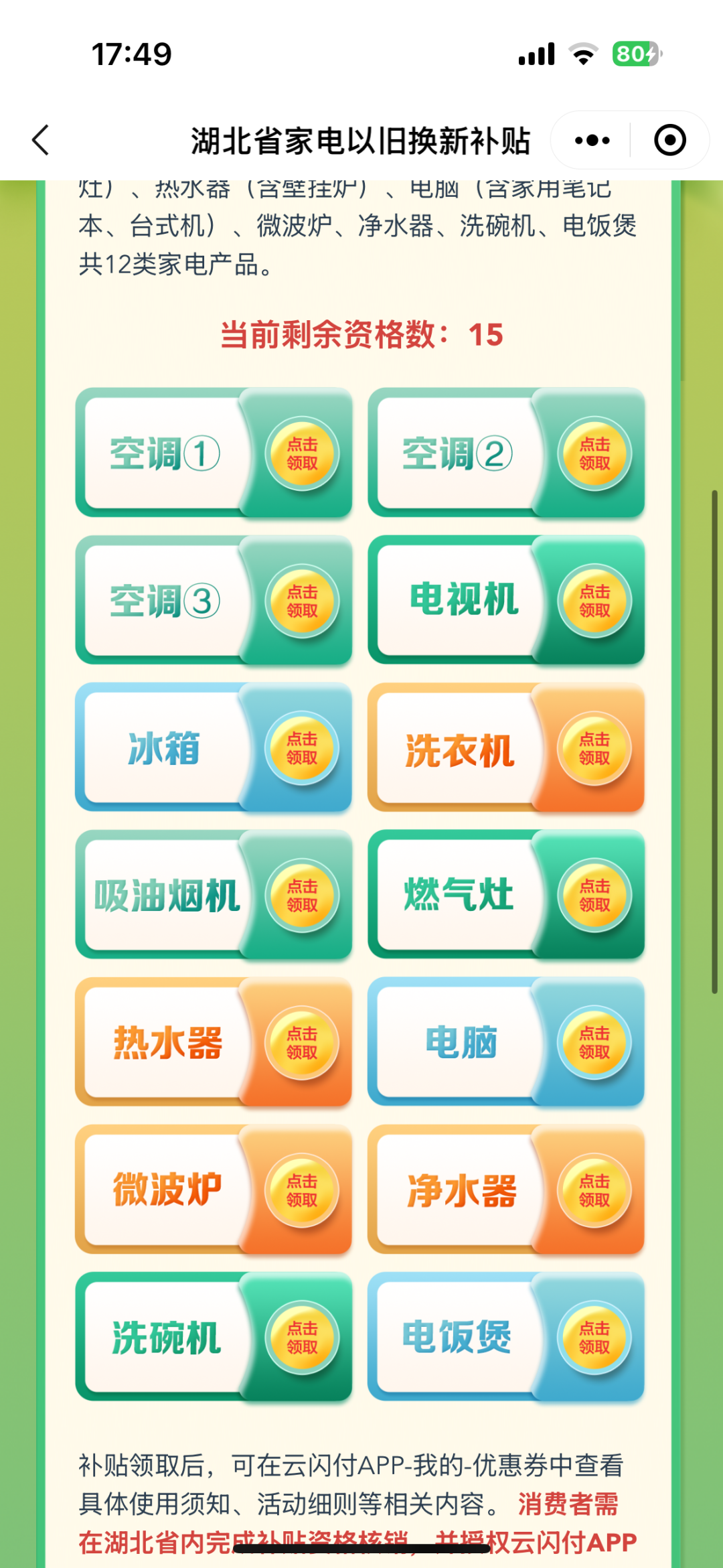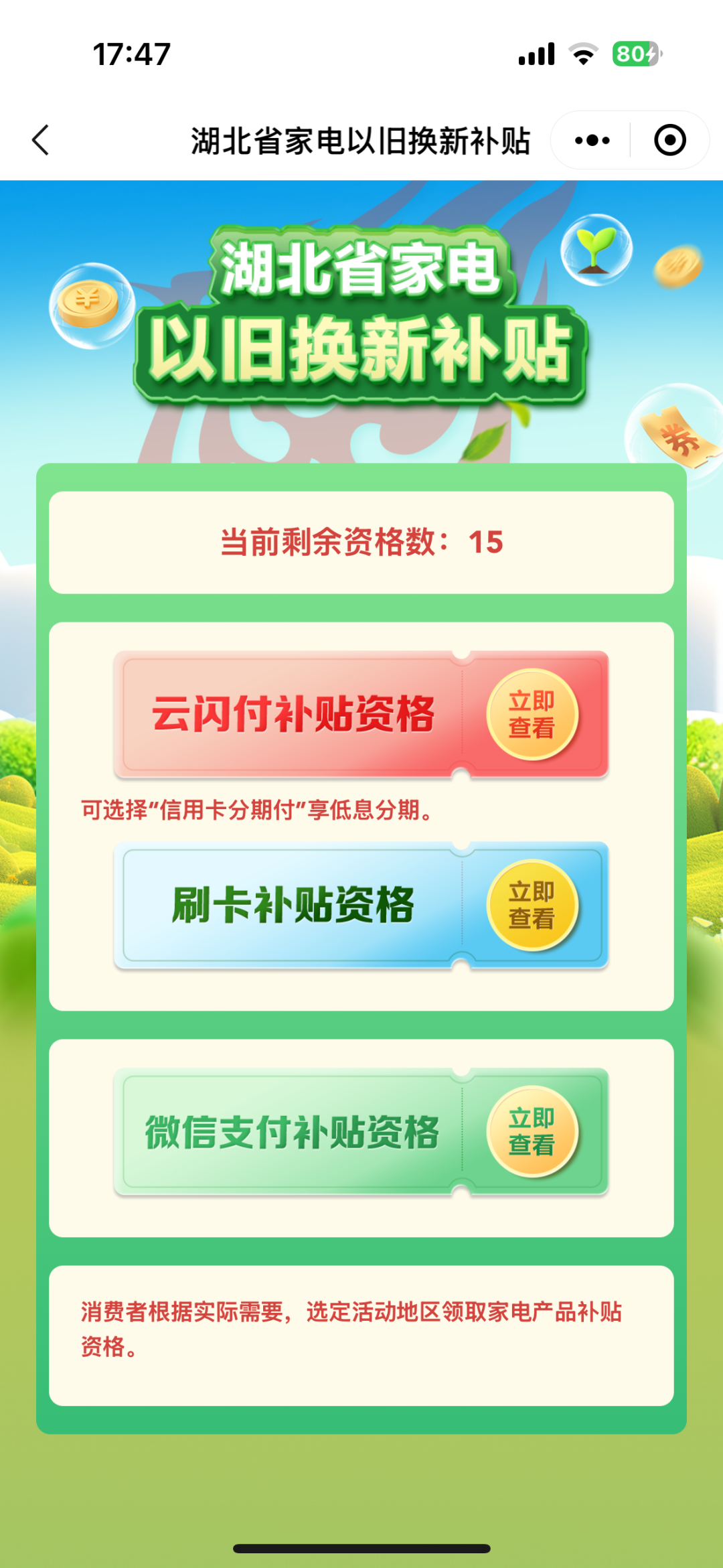 ☞第六步:根据需要选择“云闪付补贴资格”、“刷卡补贴资格”、“微信补贴资格”,点击“立即查看”进入对应入口