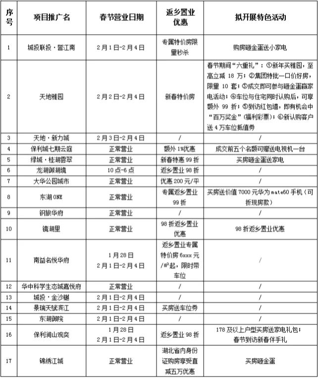 一年一度的返乡置业季如约而至,楼市上演一场抢客大战。日前,在“新洪七条”部分政策延期半年的利好下,武汉市洪山区近20个楼盘纷纷启动2025春节返乡安居购房季活动,提供专属特价房、家电大礼包、车位购买券等多重优惠和贴心服务,吸引返乡置业者。