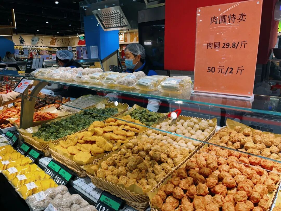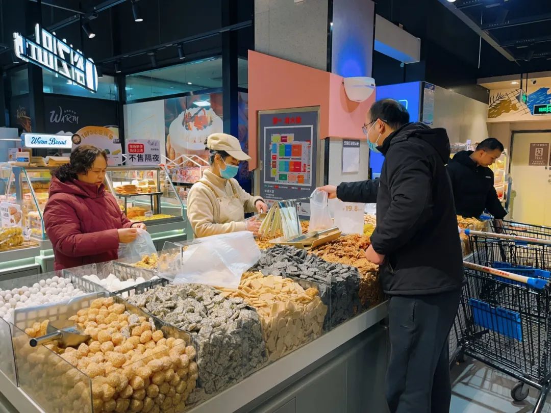 在年货专区,生鲜蛋奶、水果蔬菜、米面粮油等各类食品一应俱全,礼品、零食等众多节日商品也摆放显眼,让人目不暇接。导购员们热情推荐,市民们挑水果、捞鱼、买坚果,到处都是一片喜气洋洋、其乐融融的热闹景象。