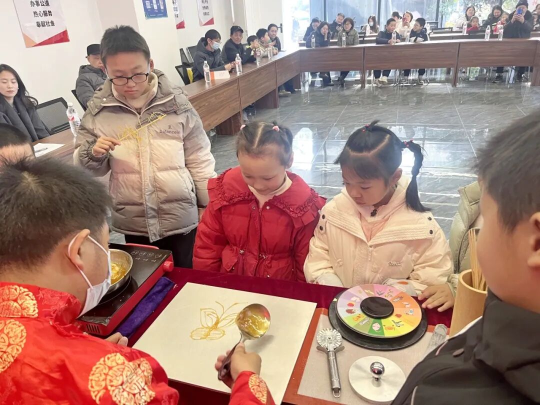 “我要一个小兔子图案。”“我要这个宝剑图案的。”活动还没开始,制作糖画的桌子就已经被参加活动的小朋友们围得严严实实。小朋友们的眼睛紧紧盯着锅里正在融化的糖,希望快一点品尝到甜甜的糖画。