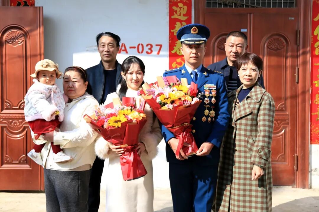 在锣鼓喧天、鞭炮齐鸣的热烈喜庆氛围中,慰问人员带着喜报、牌匾来到占昭伟家中。军地部门工作人员为占昭伟及家属披挂绶带。区人武部领导现场宣读了喜报内容,并表示:“占昭伟同志获此殊荣,是他个人的拼搏奋进,更是家人在背后默默支持的结果。二等功喜报不仅是军人的荣誉勋章,也是军属的荣耀见证,感谢家属为国家、为军队培养出这么优秀的人才。”