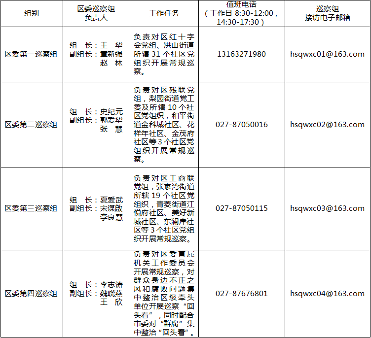 本轮巡察驻点时间60天左右,其间设立专门值班电话、电子邮箱和“荆楚码上巡”信访反映二维码,主要受理反映被巡察党组织领导班子及其成员、其他重要岗位领导干部问题的来信、来电和来访。
