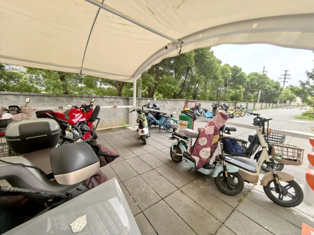当天,记者现场走访看到,新建停车棚内约有一半位子有序停放着电动车及少量自行车,车棚一侧与一所幼儿园相邻。