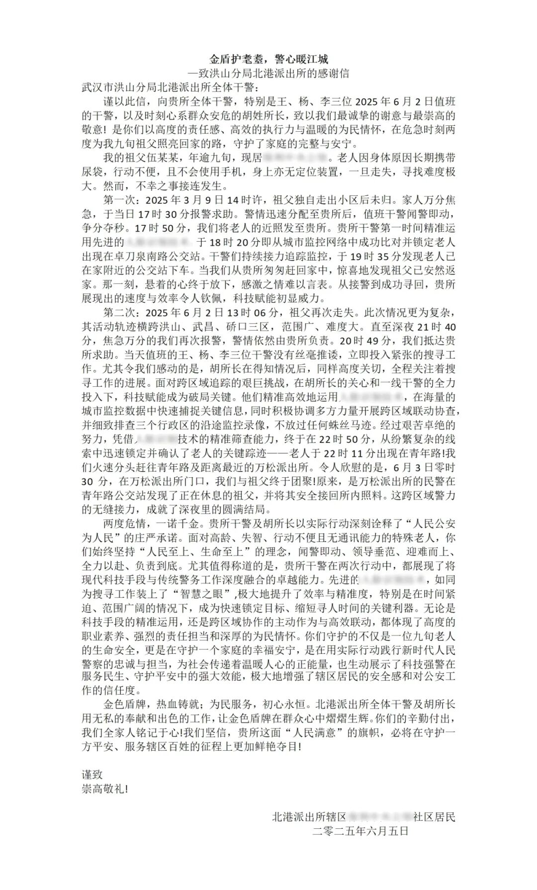 “你们守护的不仅是一位九旬老人的生命安全,更是在守护一个家庭的幸福安宁。”近日,一封长达1500字的感谢信,承载着九旬老人伍爹爹家属的深切谢意,被送到洪山警方手中。这背后,是警方两次不辞辛劳,全力帮助走失老人平安回家的暖心故事。