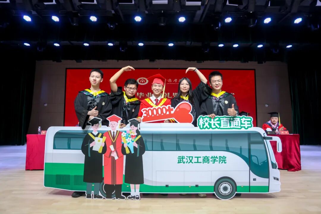 6月20日,武汉工商学院毕业典礼现场,毕业生们给校长孔建益送了一台“车”,感念校长四年来回复3万多条学生短信。