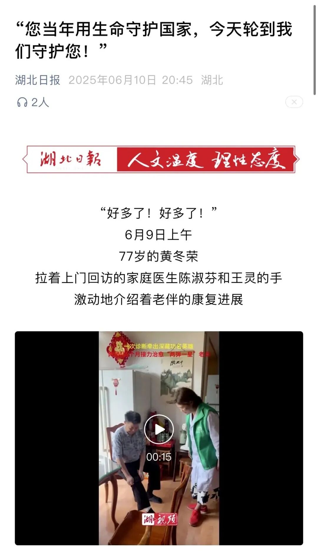“您最近腿还疼吗?”“ 最近好多了,可以走挺远了,特别感谢你们!”5月11日上午,湖北省武汉市洪山区东湖社区卫生服务站党支部书记兼主治医生陈淑芬、家庭医生王灵和与洪山区退役军人事务局工作人员像往常一样,来到79岁的老兵刘永烈家中,仔细询问他的身体情况,叮嘱用药注意事项。
