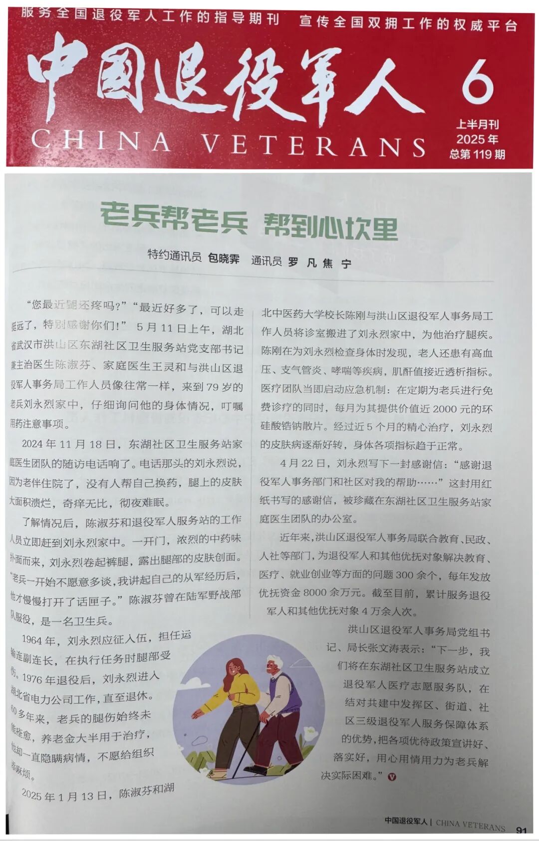 近日,洪山“老兵帮老兵”的暖心故事,相继登上国家级杂志《中国退役军人》、湖北日报官微。此前,洪山大学之城微信公众号率先报道,引发广泛关注。今天,让我们再次走进这份属于洪山老兵的力量与温情,感受那份始终如一的守望相助。