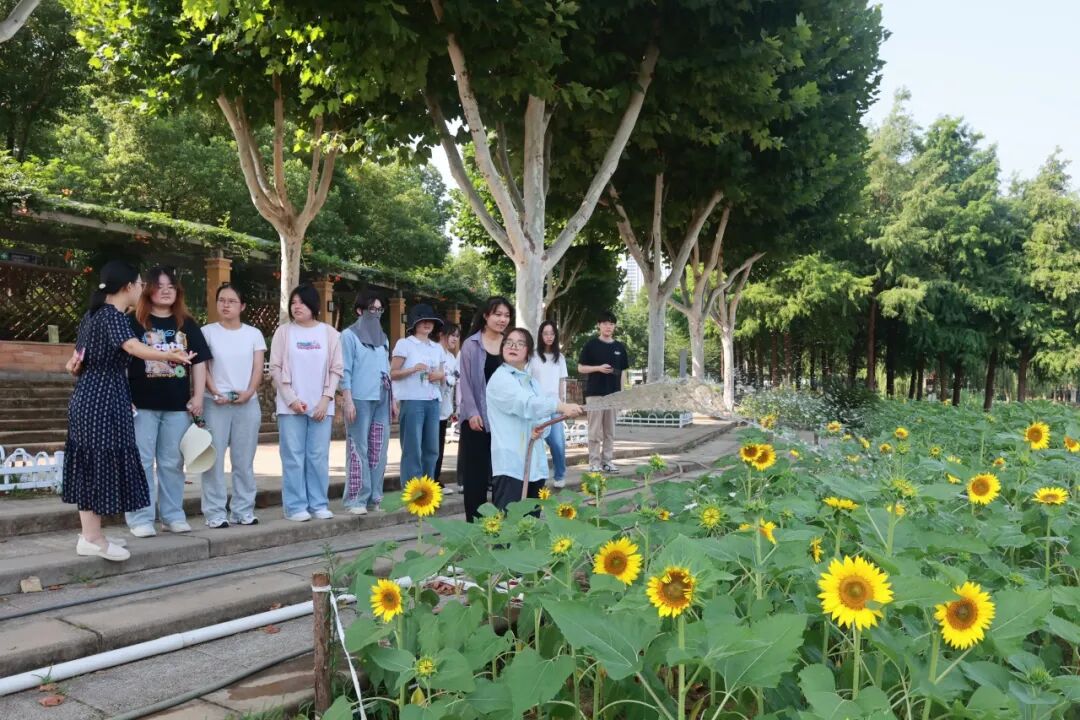 “为了让公园四季都有不同的景致,保持活力与色彩,我们会根据季节变化对植物进行轮换和更替。”洪山区公园管理中心的项悦向同学们介绍道。随后,工作人员带领大家参观了园区内今年新种植的向日葵花田,并邀请同学们体验给植物浇水。