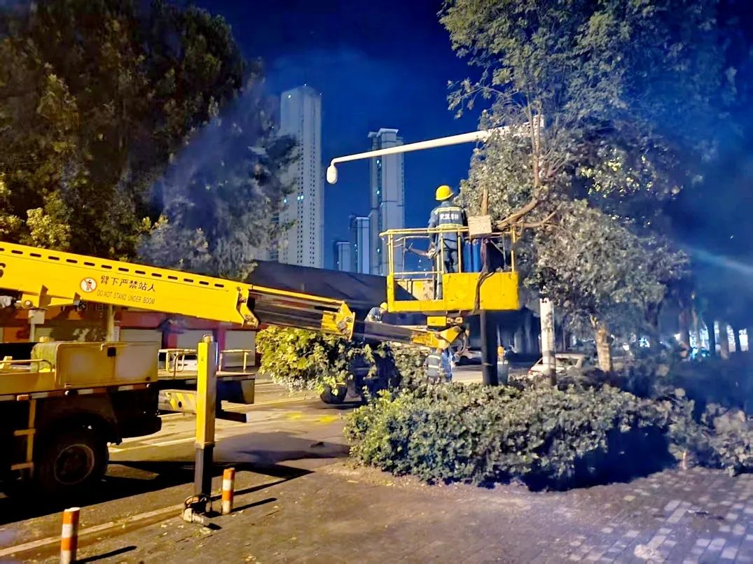 应急人员与设备迅速到位。在做好现场安全防护与警戒后,工作人员操作升降机,手持油锯、枝剪等设备连续作业数小时,汗流浃背仍坚持抢险。“首先要保障市民通行安全,尽快恢复交通,再清理倒树和修复设施。”该中心道路负责人徐晶介绍。