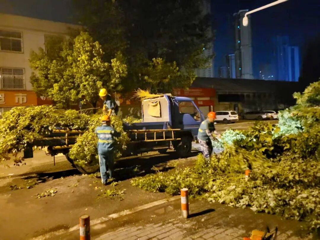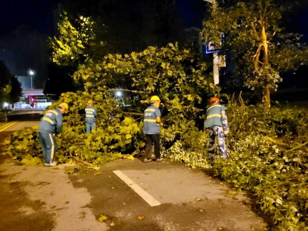 “洪山街道南李路有一株法桐倒伏,另出现3处断枝”“江国路有4株法桐倒伏,大量断枝阻碍交通”晚上10时后,接连多起报警传来,洪山区公园管理中心立即启动应急预案,调集应急人员赶赴现场实施清理。