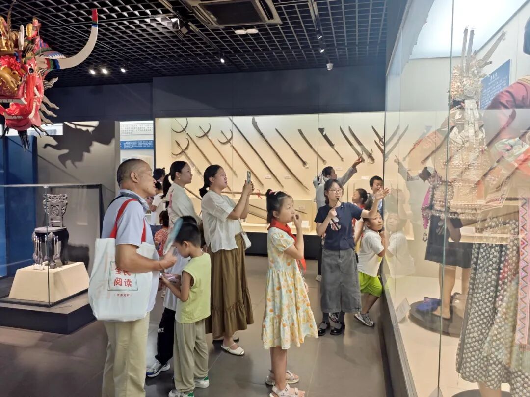在中南民族大学民族学博物馆,七个主题展厅各具特色,系统呈现了各民族的地域文化、传统技艺与民族服饰。汉代铜鼓、土家族三滴水床等珍贵文物前,居民们纷纷驻足端详。