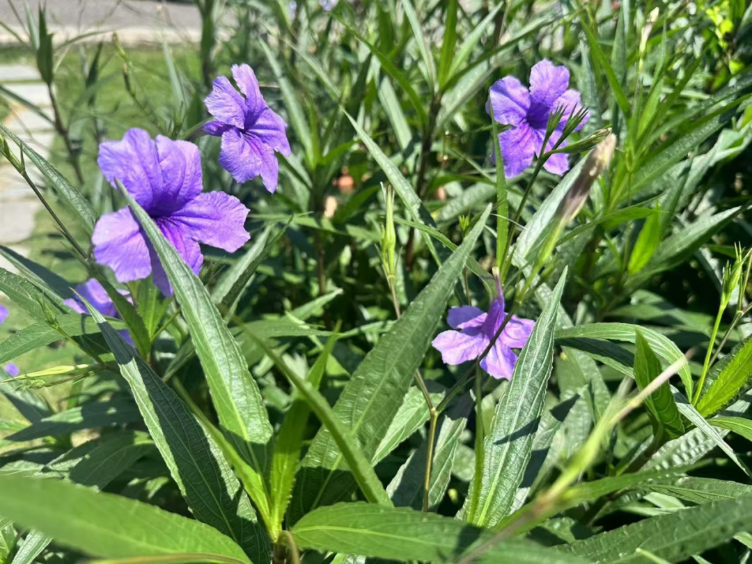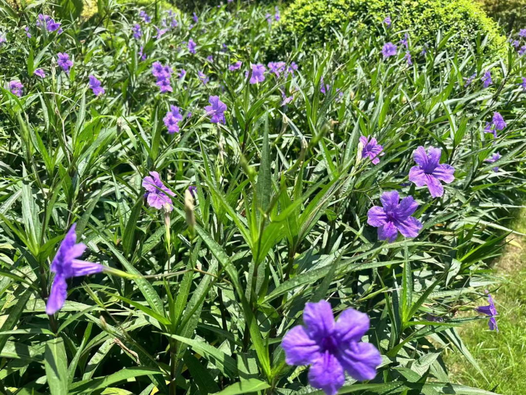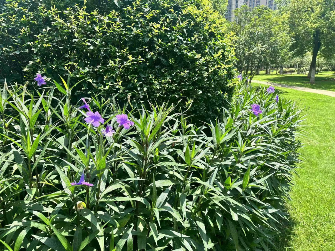 9月4日上午,洪山区杨春湖公园内,翠芦莉花开正盛。漏斗状的花冠五瓣舒展,瓣上可见放射状条纹。尽管暑气未消,这一片片紫色依然醒目夺人。“这花真有性格,天这么热,还开得这么热闹!”正在晨练的王女士一边拍照一边笑着说,“回去就发个朋友圈!”