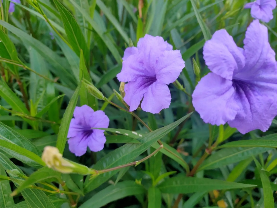 蓝花草,也被叫作“人字花”、翠芦莉。其花呈标准漏斗形,之所以得名“人字花”,是因为它的叶片——单叶对生,线状披针形,微微舒展,形如“人”字。新叶与叶柄泛着紫红,老叶则转为暗绿。虽名叫“蓝花草”,花色实为蓝紫,兼具耐高温、耐晒、耐水湿的特性。