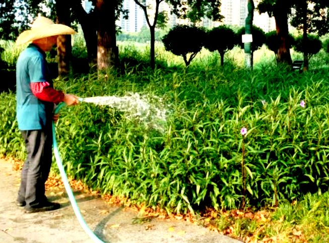 在洪山区毛坦公园,养护人员正为翠芦莉浇水。其紫色花瓣每日如新,因花形似喇叭,常被市民误认作喇叭花。“这花皮实好养,耐高温,其他植物一天一浇水,它两三天一次就行。花期能从3月一直开到11月。”养护人员傅波说。