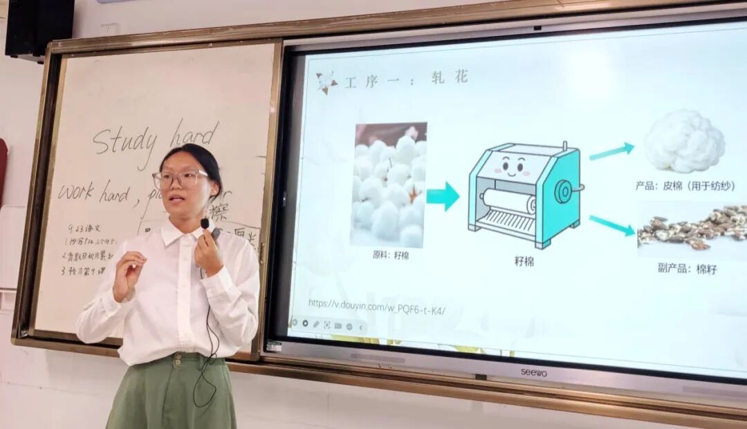 当日下午,四年级的同学们走进棉花科研基地开展了一堂特殊的实践课。华中农业大学植科院姜怡慧老师以“一朵棉花的奇迹”为主题,通过图文并茂的讲解,向同学们揭示了从棉籽到纺织品的生命历程,重点科普了转基因抗虫棉等我国农业科技突破成果。