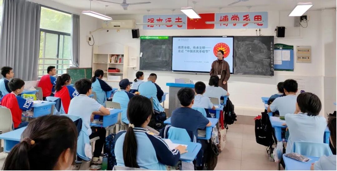 “教授,农业文化遗产和我们的生活有什么关系呀?”“现在都用高科技种地了,传统农耕还有意义吗?”面对同学们的提问,朱教授结合良渚古城遗址的稻作文化、陕西的古梯田等案例,耐心解答:“传统农耕里藏着‘天人合一’的生态理念......丰收节不仅是庆祝丰收,更是提醒我们要珍惜粮食、尊重农民。”同学们还纷纷分享了自己参与“光盘行动”“阳台种菜”的经历,现场掌声不断。