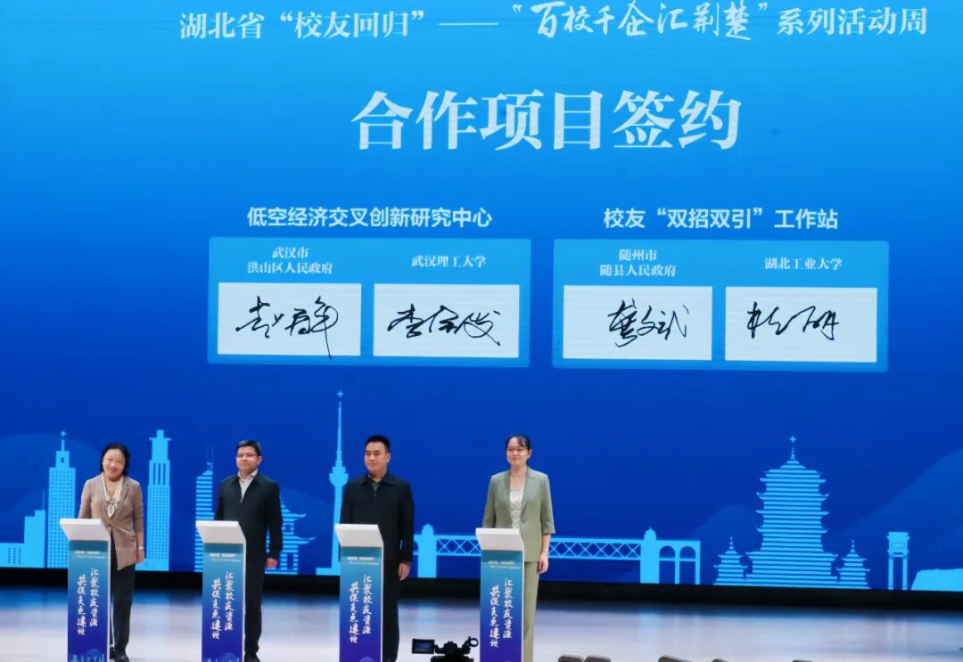 启动仪式上,洪山区人民政府作为地方政府代表与武汉理工大学现场签约“低空经济交叉创新研究中心”合作协议,标志着校地合作迈向更深层次、更广领域。洪山区商务局在“生命健康”产业专场作现场推介,向与会校友企业全面展示了洪山区的产业优势与招商政策,进一步增强了区域吸引力。