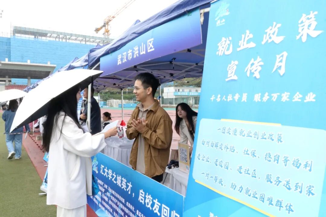 在“百校千企汇荆楚”校友专场招聘活动现场,洪山区委人才办和洪山区人力资源局工作人员积极为求职人员讲解洪山人才政策并发放宣传册。