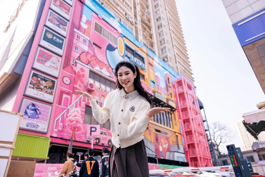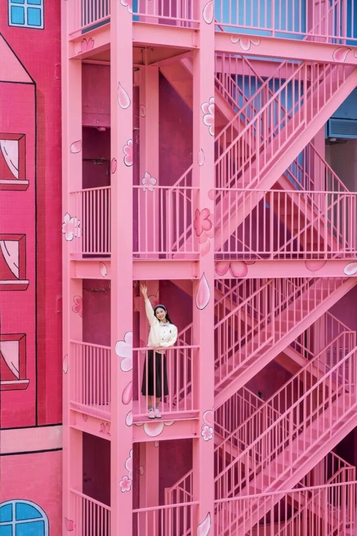 高达五层楼的涂鸦墙,以粉色为主调,巧妙融入了赛博朋克风格的机械狗、酣睡的萌猫与盛放的樱花树、粉色阶梯,“多巴胺配色”传递着浓郁的青春气息。