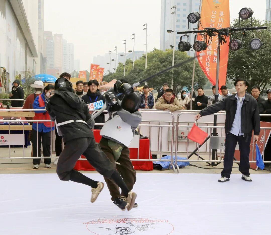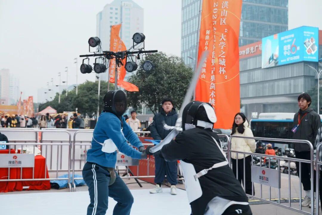 迂回试探、静默对峙,终于在一瞬间暴起交锋,完成“一剑封喉”。12月20日,“大学之城杯”2025全民体能暨古典剑术挑战赛在洪山区街道口银泰创意城举行。每次交锋后,现场观众从屏息凝神转为热烈喝彩,掌声不断。