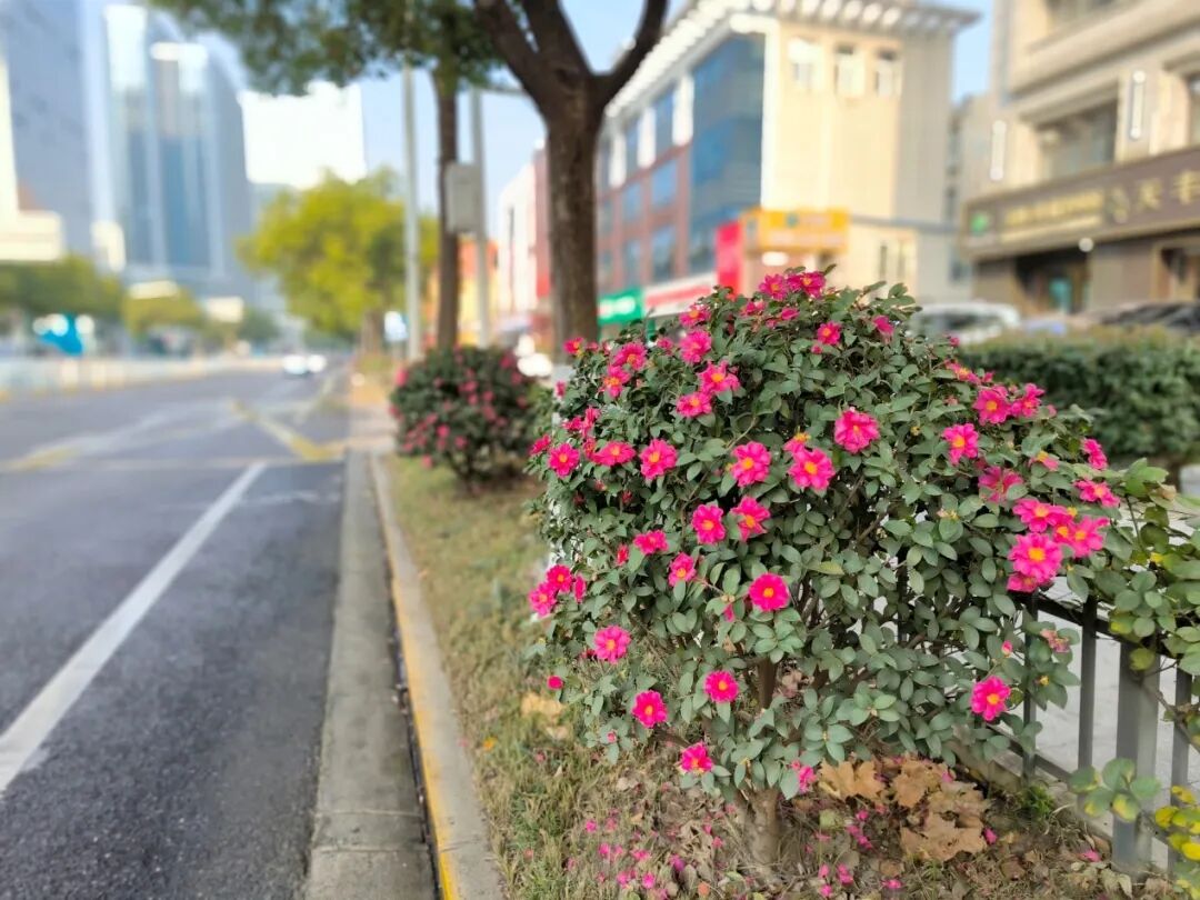 近期,洪山区书城路两侧茶梅渐次绽放,为寒冷季节增添了一抹亮色,吸引不少市民驻足观赏。