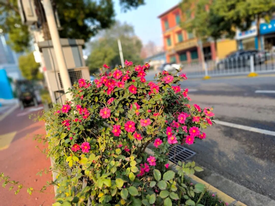 记者在现场看到,一株株茶梅已迎来盛花期。粉色、红色、白色花朵缀满枝头,如霞似锦,点亮了整条街道,也映亮了过往行人的眼眸。微风过处,清香徐来,不少市民放缓脚步,拍照留念,俯身轻嗅。一对散步的老夫妇笑着说:“以前冬天街上光秃秃的,现在看到这些花开着,心情都亮堂了,感觉特别温暖。”