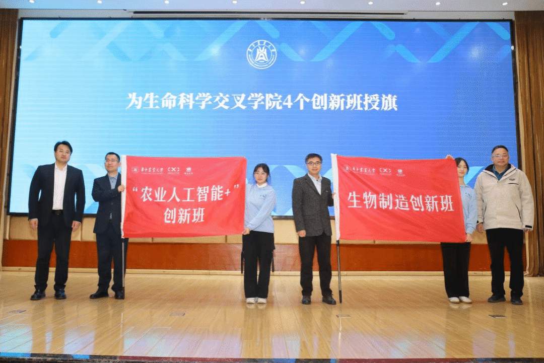 青平副校长、李大鹏副校长分别为狮山生物科学英才班、“农业人工智能+”创新班、数智育种创新班、生物制造创新班4个创新班授旗.