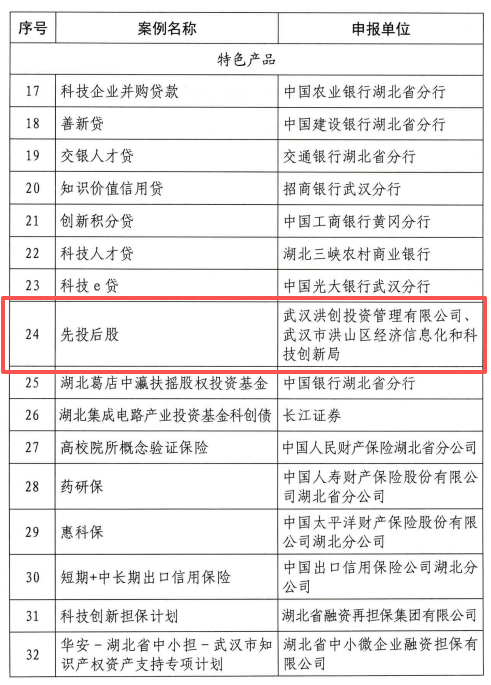 近日,省科技厅、省财政厅、省地方金融管理局、人民银行湖北省分行、湖北金融监管局、湖北证监局联合开展了2025年度湖北省科技金融典型案例征集遴选工作。洪山区“先投后股”作为特色产品(武汉市唯一)成为全省金融支持科技创新的50项优秀典型案例之一。