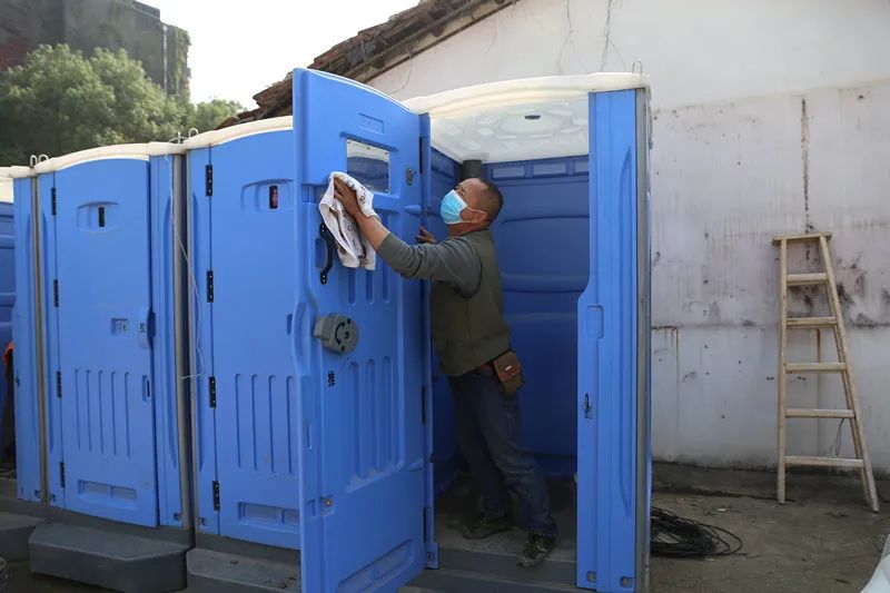 上午10时,记者在小区看到原来旧厕所已经封闭,一座可供四人使用的移动厕所已经建设完工,工人们正在做清洁打扫工作。