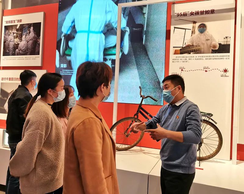 “一代人有一代人的英雄,这是最可爱的平凡英雄!”11月5日,梨园街鹏程社区党委联合下沉单位一行80人前往“武汉客厅”参观抗击疫情专题展,青年党员王辰看到“95后”护士甘如意的自行车后,心生敬佩并拍照留念。
