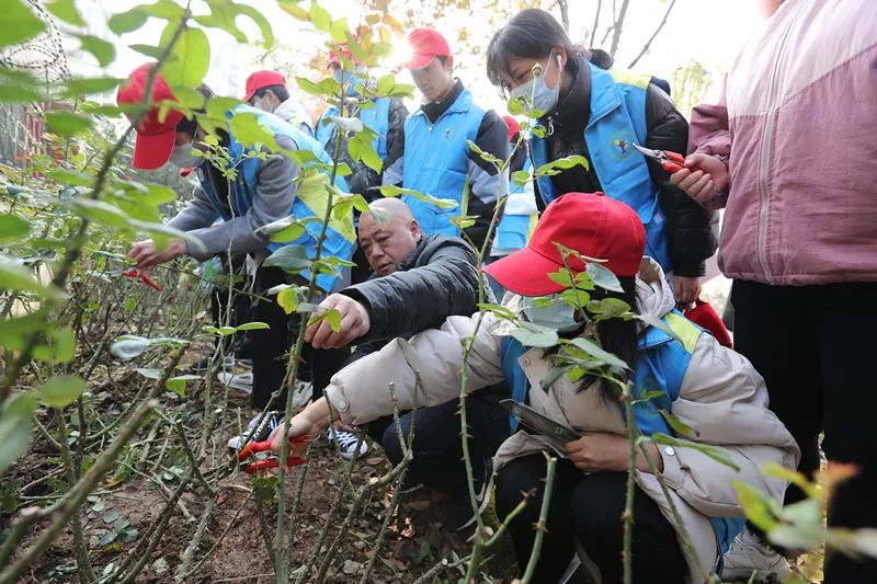 在南湖幸福湾公园,区园林局提供了大片的月季布景,供大学生志愿者“施展拳脚”。现场,园林农艺师普及了月季日常养护知识,演示了冬季月季修剪要领。