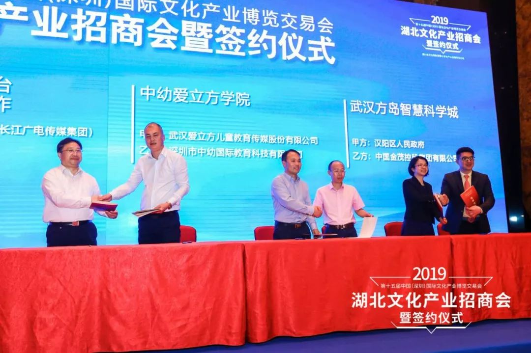 在本届文博会的湖北文化产业招商会暨签约仪式上,洪山辖区重点文化企业武汉爱立方儿童教育传媒股份有限公司与深圳市中幼国际教育科技有限公司成功牵手,打造中幼爱立方学院项目。